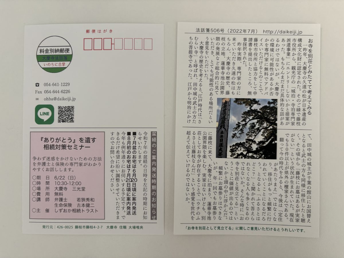遠方の檀家さんとはコミュニケーションが疎遠になりやすいので、大慶寺では毎月「法話箋」というはがきを全檀家とその下の世代、檀家でない人にも送付して関係性を維持しています。