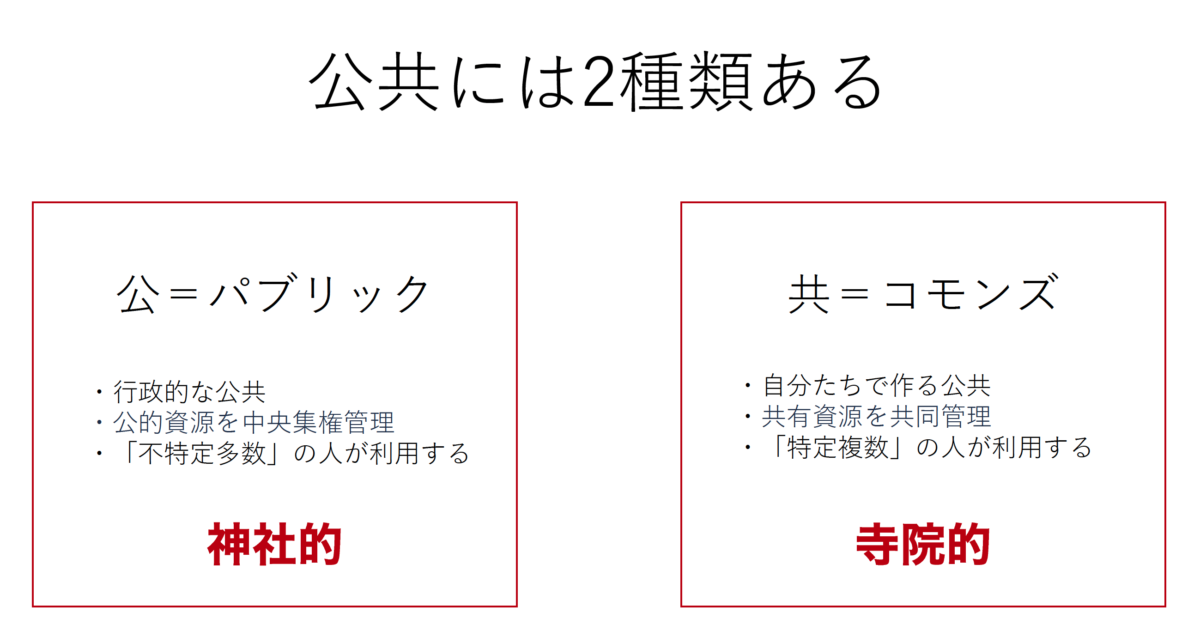 昨今「公共の場」には2種類あると言われています。不特定多数の人が自由に利用できる、例えば行政が運営する施設などの「Public」な場。これに対して特定複数の人が利用する、自分たちで作る公共の概念を「Commons」と呼んだりします。