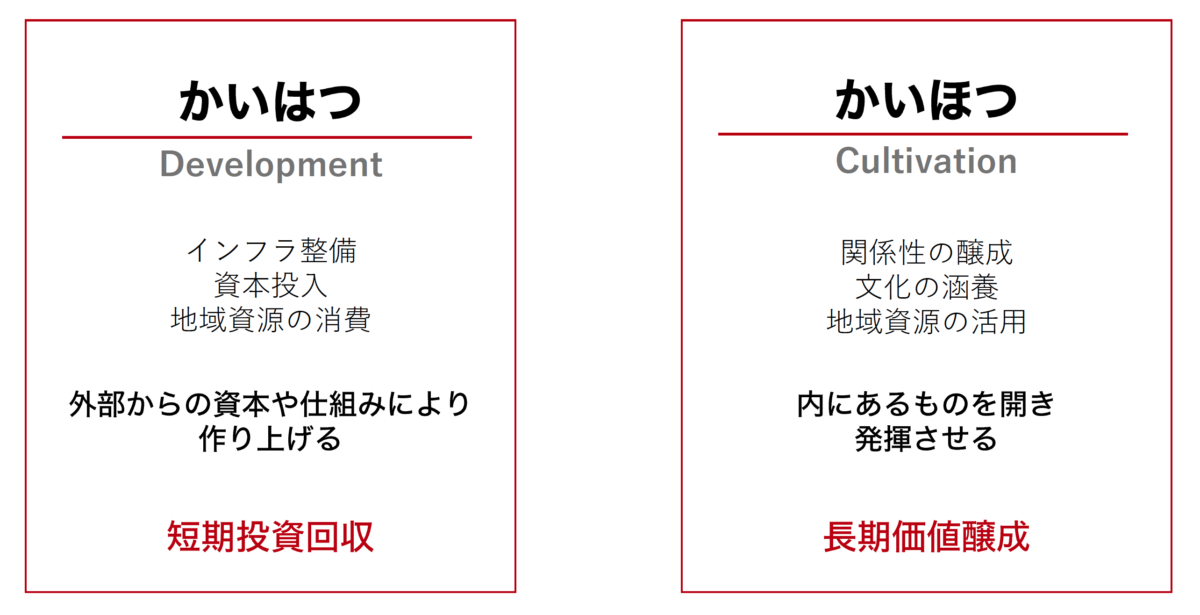 「Development」という意味での開発(かいはつ)はインフラや資本を投入し、地域資源を消費しながら稼ぐ短期的な投資回収型のイメージ。一方、開発(かいほつ)は英語で表すならば「Cultivation」。人々の関係性や文化の醸成、地域資源の活用を重視し、長期的な価値醸成を目指すもの。