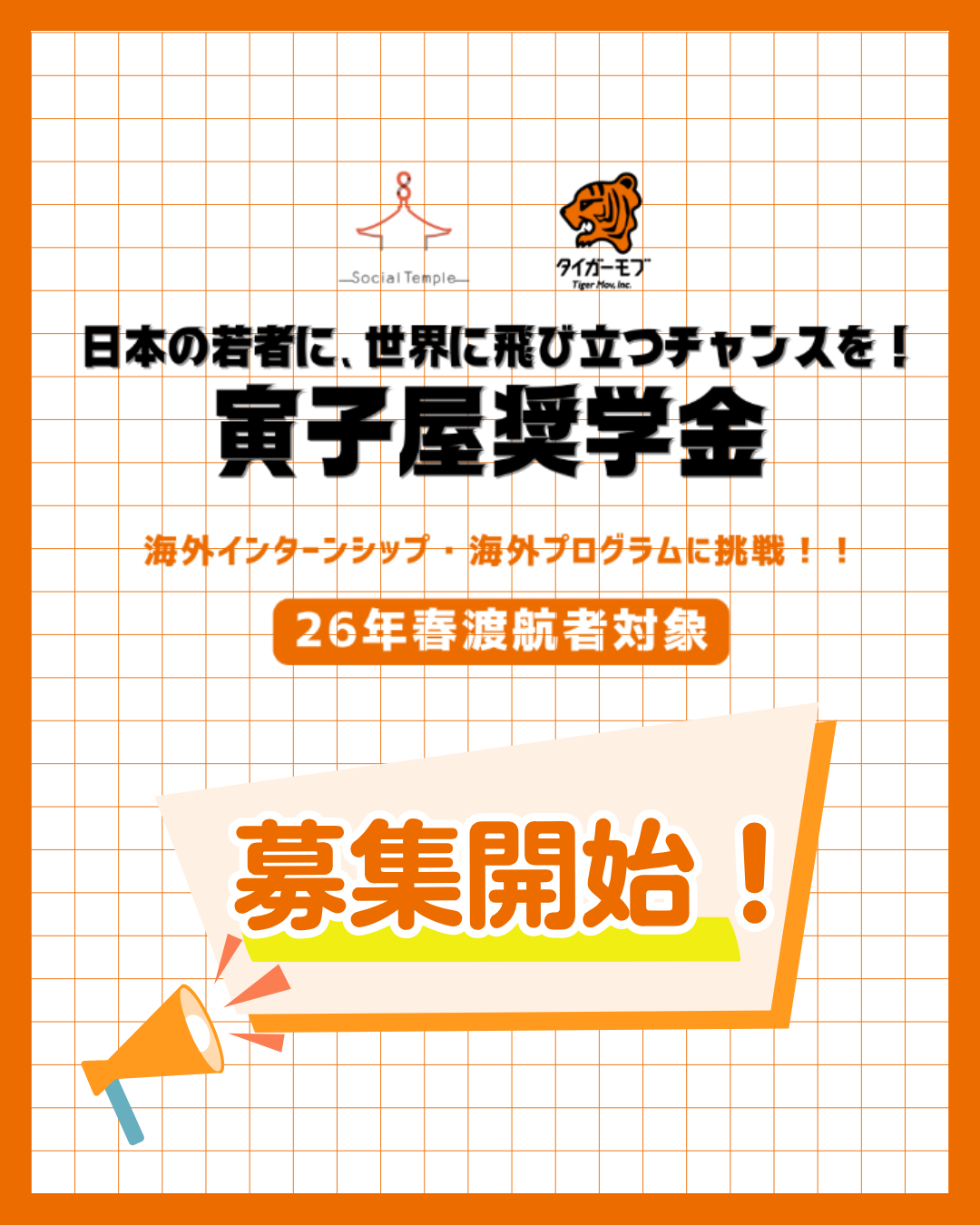 越境探究プログラムを提供するタイガーモブと(一社)SOCIAL TEMPLEがコラボする「お寺奨学金」が今年は「寅子屋奨学金」にパワーアップします!!