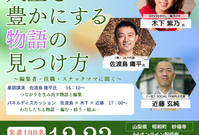 12月23日(火) 妙福寺に豪華ゲストが集結! あらゆる情報があふれ、変化のスピードが加速する現代。 そんな時代を生き抜く“土台”となるものは何でしょうか。 SOCIAL TEMPLEではこの問いに向き合うため、「物語」 … 続きを読む 【講演会のお知らせ(対面・オンライン併用)】人生を豊かにする物語の見つけ方 〜編集者・住職・スナックママに聞く〜