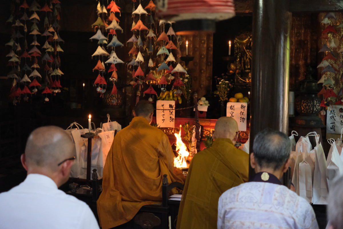 その「善光寺如来様」の護摩法要が、毎年8月20日に祈願祭としておこなわれています。複数のお坊さんたちによる盛大な法要が行われる中、住職さんが護摩を焚き続けます。